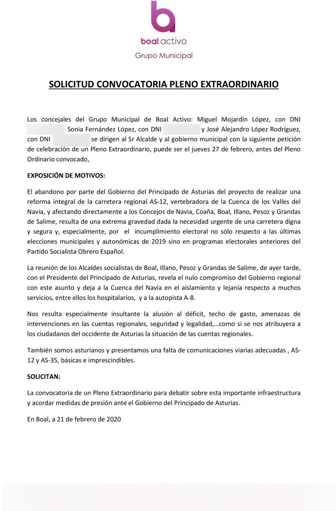 El grupo municipal Boal Activo solicita la convocatoria de un pleno con carácter extraordinario en el ayuntamiento de Boal para debatir sobre la carretera As-12 “y acordar medidas de presión ante el Gobierno del Principado de Asturias”. Sugiere la formación que se podría celebrar el jueves 27 de febrero, antes del Pleno Ordinario convocado para tal fecha.
