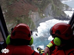 Por tierra efectivos de Bomberos del SEPA (Servicio de Emergencias del Principado de Asturias) con base en el parque de Pravia han vuelto a rastrear los pedreros donde se vio por última vez al desaparecido, desde San Esteban a la playa del Aguilar.