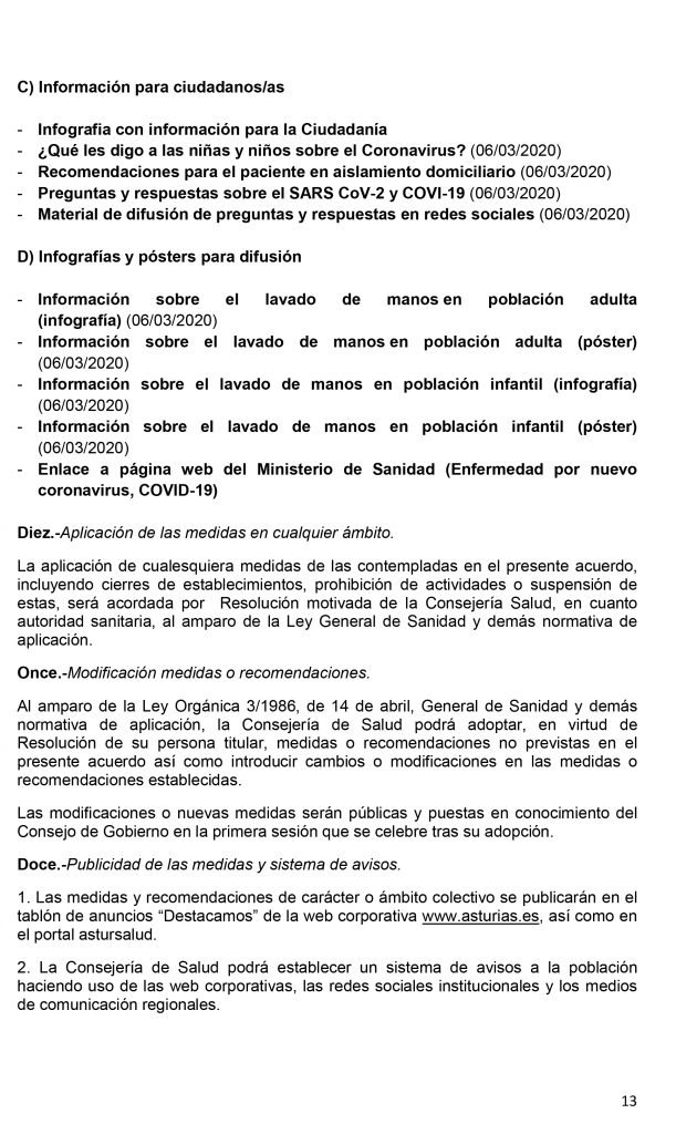 El Consejo de Gobierno del Principado de Asturias celebrado en la tarde de este jueves ha acordado, entre otras medidas, la suspensión temporal de la actividad docente presencial- el asistir a clase- desde el viernes, 13 de marzo, en todas las etapas, ciclos, grados, cursos y niveles de enseñanza, así como de las actividades complementarias y extraescolares, de todos los centros educativos autorizados, ubicados en Asturias por un plazo de catorce días naturales, sin perjuicio de las prórrogas que, en su caso, pudieran acordarse de forma sucesiva. Las etapas, ciclos, grados, cursos y niveles de enseñanza afectados por la suspensión son las siguientes: Educación infantil de 0 a 6 años; Educación primaria; Educación Secundaria Obligatoria; Bachillerato; Formación Profesional; Enseñanzas de idiomas; Enseñanzas artísticas; Enseñanzas deportivas; Educación de personas adultas y Enseñanza universitaria.