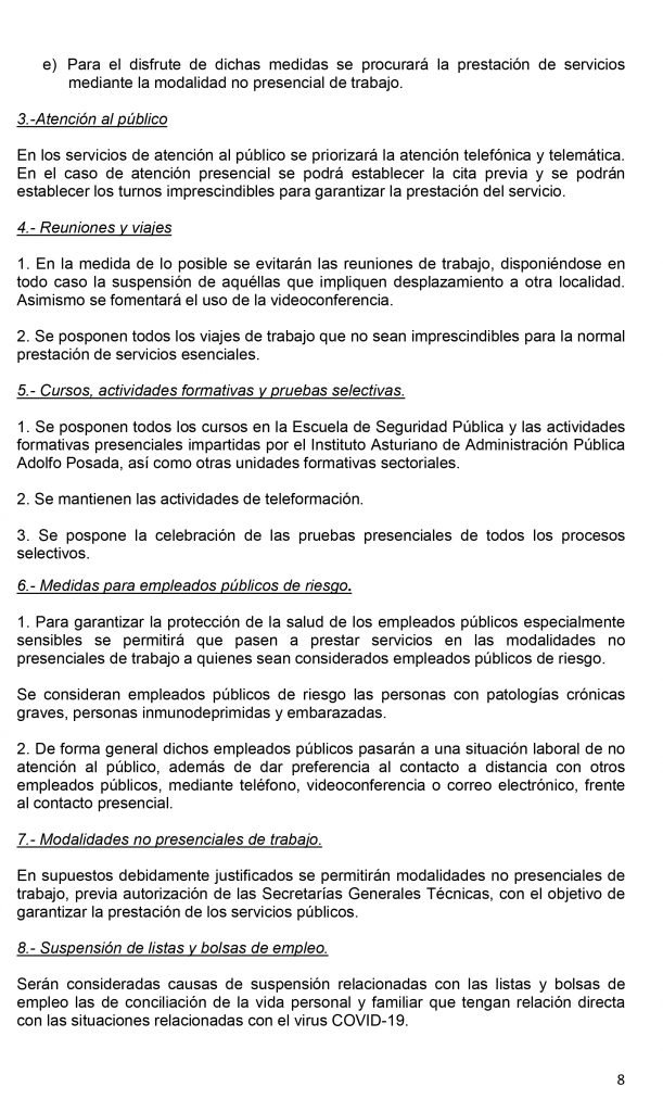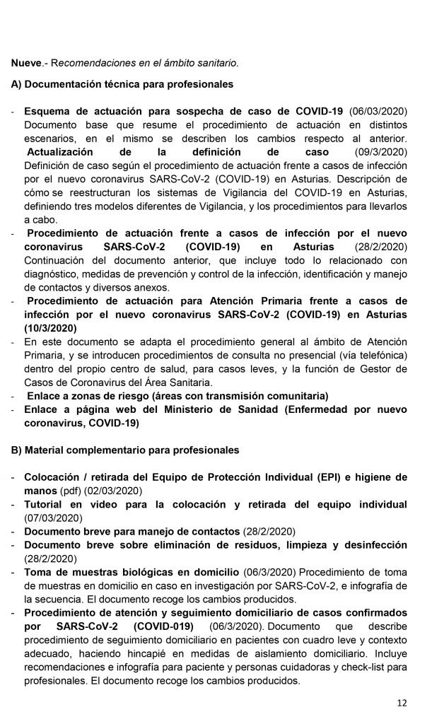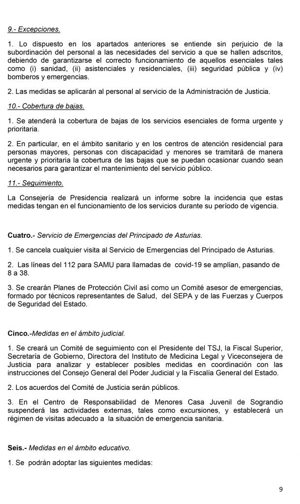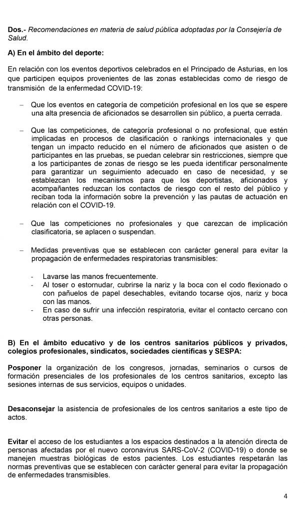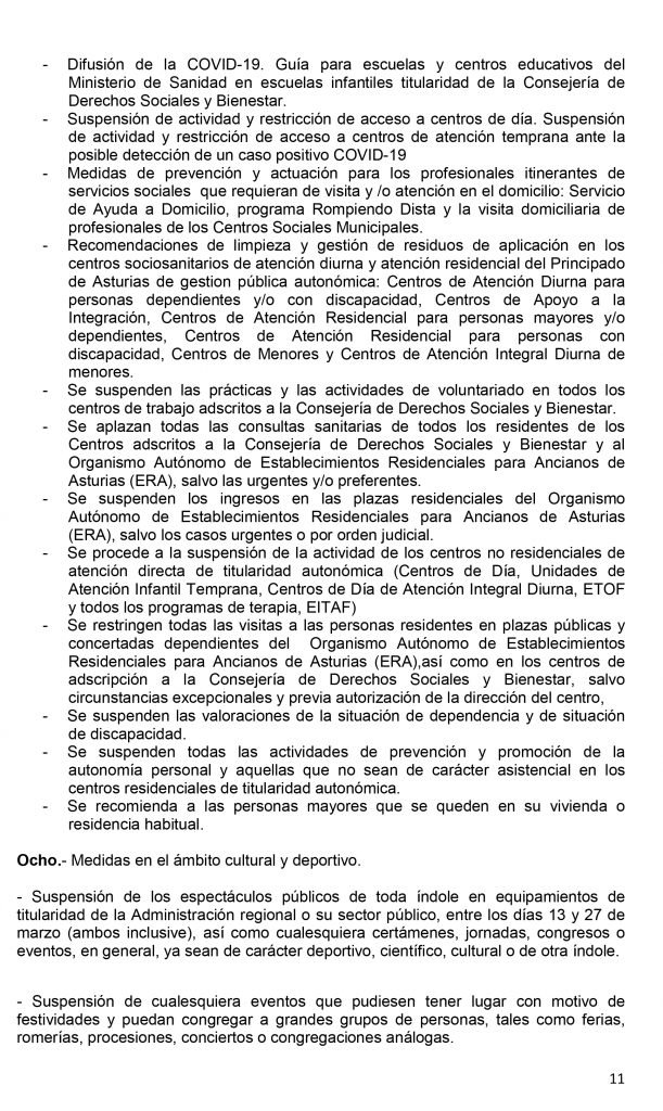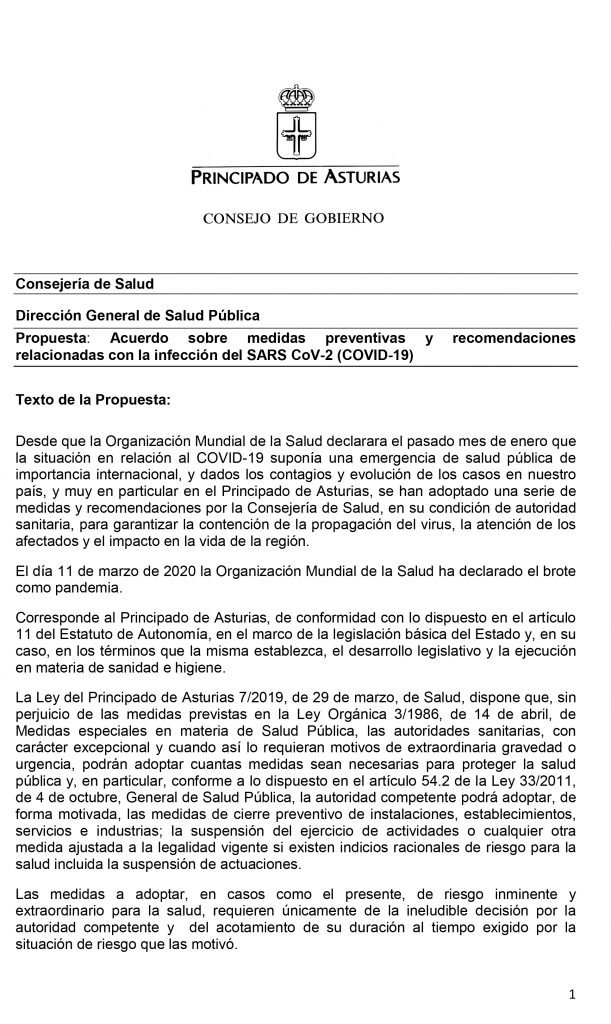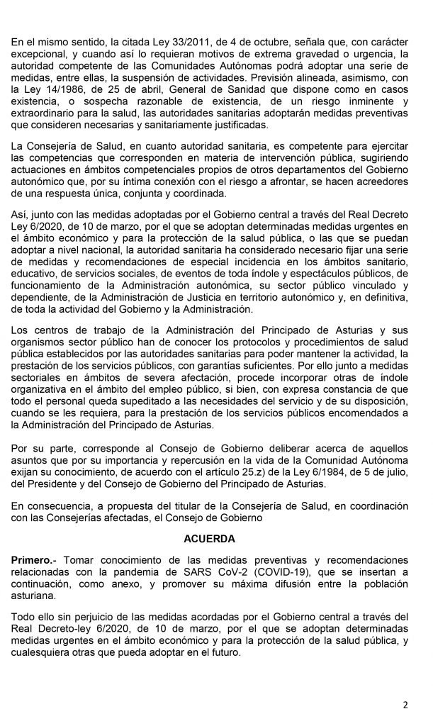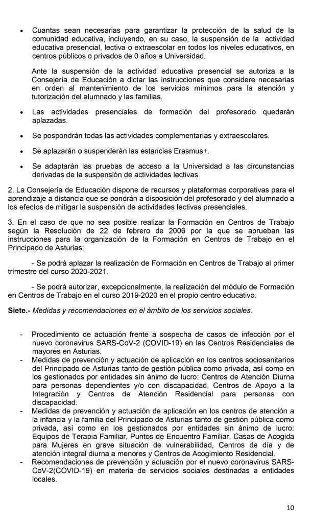 El Consejo de Gobierno del Principado de Asturias celebrado en la tarde de este jueves ha acordado, entre otras medidas, la suspensión temporal de la actividad docente presencial- el asistir a clase- desde el viernes, 13 de marzo, en todas las etapas, ciclos, grados, cursos y niveles de enseñanza, así como de las actividades complementarias y extraescolares, de todos los centros educativos autorizados, ubicados en Asturias por un plazo de catorce días naturales, sin perjuicio de las prórrogas que, en su caso, pudieran acordarse de forma sucesiva. Las etapas, ciclos, grados, cursos y niveles de enseñanza afectados por la suspensión son las siguientes: Educación infantil de 0 a 6 años; Educación primaria; Educación Secundaria Obligatoria; Bachillerato; Formación Profesional; Enseñanzas de idiomas; Enseñanzas artísticas; Enseñanzas deportivas; Educación de personas adultas y Enseñanza universitaria.