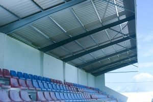 Saneamiento integral de la estructura de hierro del techo de la tribuna, con rascado y eliminación del óxido en todos los soportes y la posterior aplicación de dos manos de imprimación antioxidante, finalizando con esmalte de poliuretano especial para exteriores.