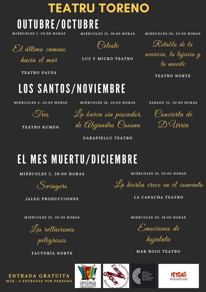 La Concejalía de Cultura de Cangas del Narcea retoma la programación cultural del Teatro Toreno. Lo hará con un total de nueve obras que se representarán cada miércoles. Para acceder a los espectáculos será necesario cumplir con las normativas sanitarias, usando mascarilla en el interior del teatro; será obligatorio reservar la entrada, que será gratuita, y retirarla en la Casa de Cultura hasta el día de la representación antes de las 13.30 horas, pudiendo retirar un máximo de cuatro entradas por persona. La taquilla del propio teatro permanecerá cerrada y los espectadores deberán inscribirse en un registro con nombre y teléfono, respetar la distancia de seguridad y utilizar tan solo las butacas habilitadas. El concejal de Cultura de Cangas del Narcea es José María Álvarez Carro.