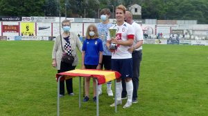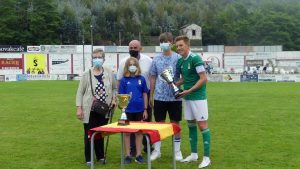 Familiares de Armando Méndez hacen entrega de los trofeos a los capitanes de ambos equipos Mossa y Susaeta.