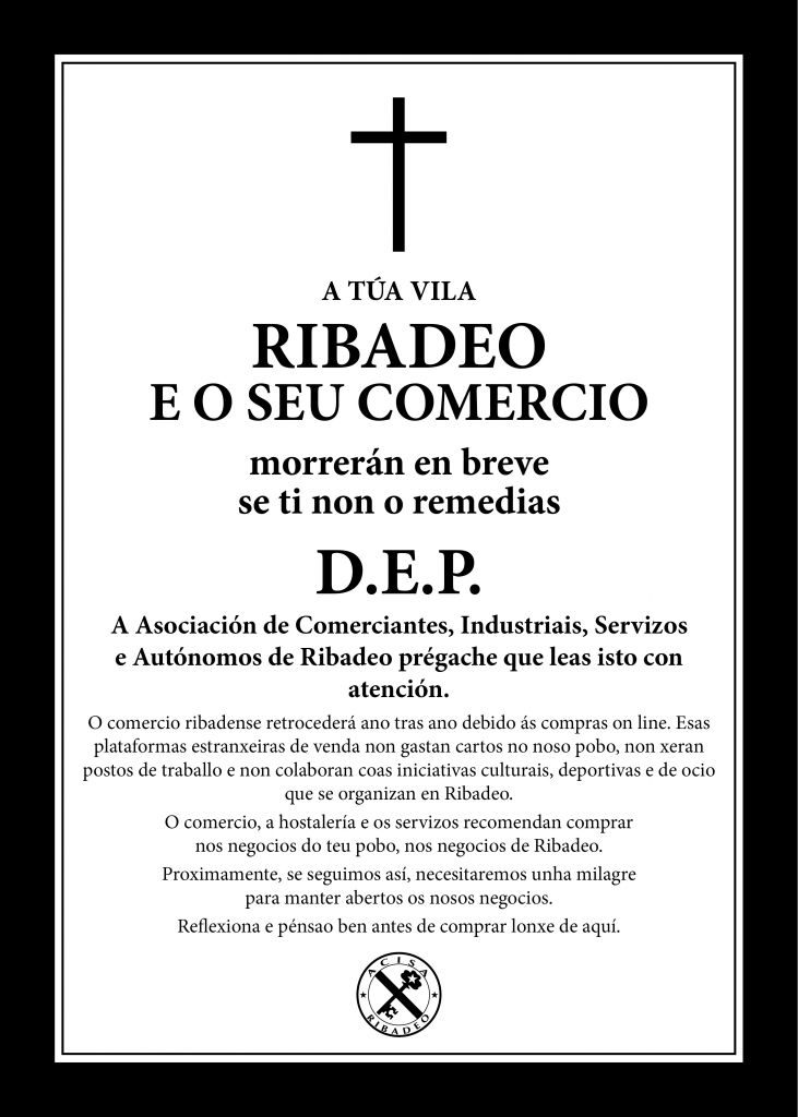 Acisa, la Asociación de Comerciantes de Ribadeo, se suma a la campaña que promueve la Federación de Comercio de A Mariña. Además de animar a los negocios de Ribadeo a apagar sus escaparates y rótulos este viernes, desde las 20 h, ha distribuido 200 esquelas de gran tamaño por toda la villa para sensibilizar a la población de la importancia que tienen comercio y hostelería para los pueblos. Jesús Pérez es el gerente de ACISA.