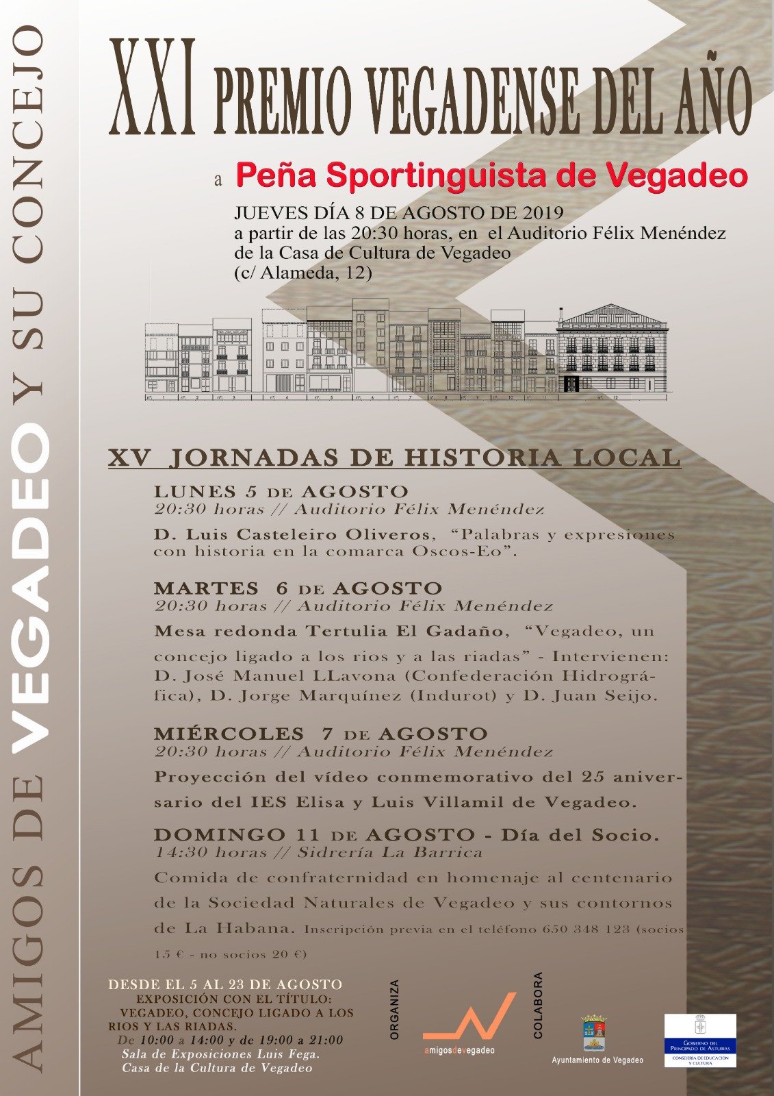 La Asociación de Amigos de Vegadeo y su concejo organiza durante la semana del 5 al 11, diversas actividades de interés: Las Jornadas de Historia local (días 5 y 6); la proyección del vídeo del XXV aniversario del Instituto de Secundaria (día 7); la entrega del premio Vegadense del Año (8 de agosto); el domingo 11, comida del Día del socio y la presencia del cónsul de Cuba para celebrar también en Vegadeo, el centenario de la Sociedad de Naturales de Vegadeo y sus contornos con sede en La Habana.