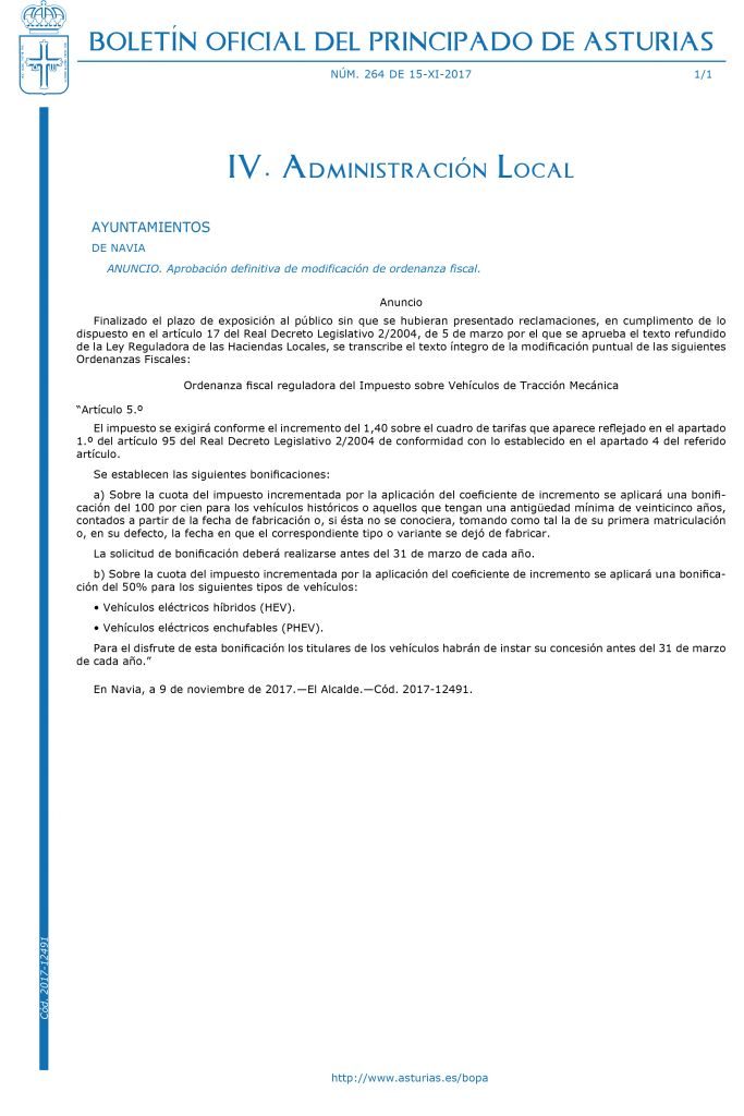 En Navia ha  quedado definitivamente aprobada la ordenanza fiscal reguladora del impuesto sobre vehículos de tracción mecánica- en su artículo número 5- con bonificaciones del 50% para vehículos eléctricos híbridos, para vehículos eléctricos enchufables y bonificación del 100% para los vehículos históricos (aquellos que tengan una antigüedad mínima superior a 25 años a partir de su fecha de fabricación o, si no se conoce, de la primera matriculación). Para disfrutar de esta bonificación, los titulares de los vehículos deben pedir su concesión antes del 31 de marzo de  cada año.
