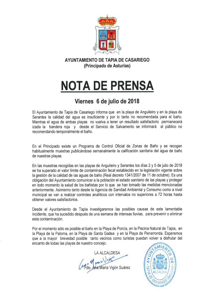 Este viernes se ha procedido a izar la bandera roja, que prohíbe el baño, en las playas de El Anguileiro y de Serantes, en Tapia de Casariego, por falta de calidad en las aguas, en las que se ha detectado contaminación fecal por encima de los límites legalmente establecidos. La Agencia de Sanidad Ambiental y Consumo y el propio ayuntamiento  realizarán nuevos análisis con intervalos no superiores a las 72 horas hasta que los valores sean satisfactorios. El equipo de gobierno investigará las «posibles causas de este incidente, para prevenir o eliminar esta contaminación». Por ahora, el baño sólo es posible en las playas de Porcía, la Paloma, Santa Gadea, Penarronda y en la Piscina Natural de Tapia.