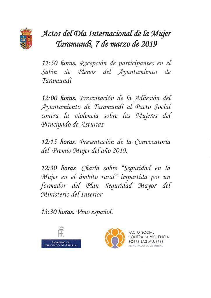 El Ayuntamiento de Taramundi se suma a los actos conmemorativos del Día de la Mujer: este jueves, 7 de marzo al mediodía, en el Salón de Plenos del Ayuntamiento, se presentará la adhesión del municipio al Pacto Social contra la violencia sobre las mujeres del Principado de Asturias, la convocatoria del Premio Mujer del año 2019 y se impartirá una charla sobre «Seguridad en la mujer en el ámbito rural» a cargo de un formador del Plan Seguridad Mayor.