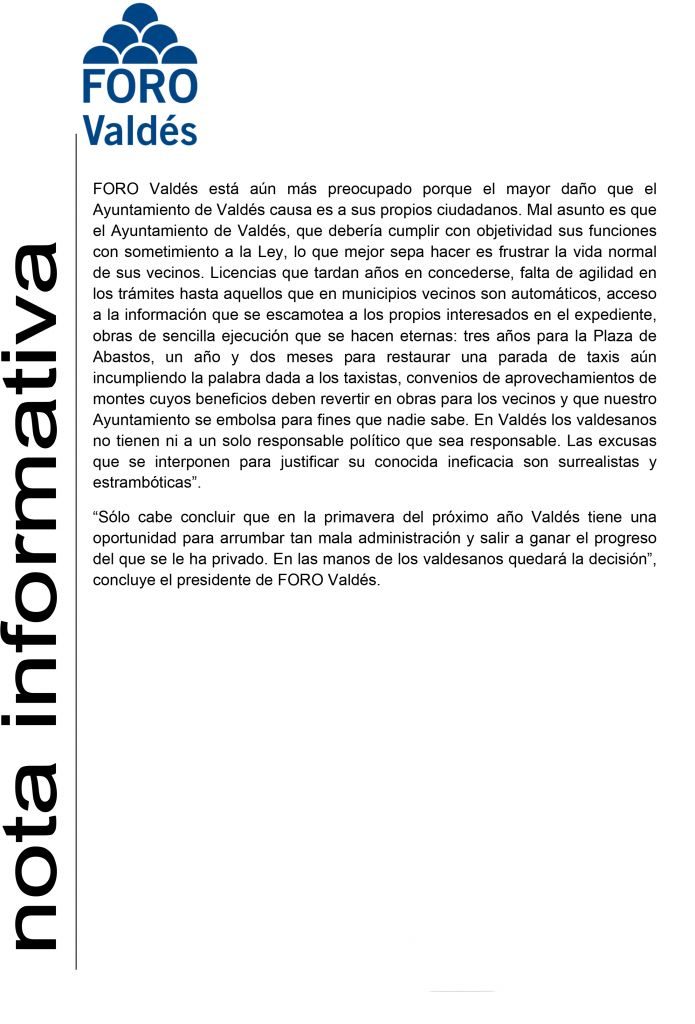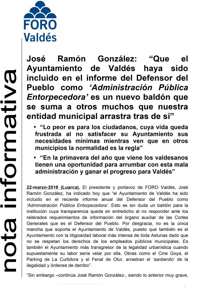 Precisamente en estas últimas horas, el presidente y portavoz de FORO Valdés, José Ramón González, ha indicado este jueves que la inclusión del ayuntamiento en el reciente informe anual del Defensor del Pueblo como ‘Administración Pública Entorpecedora’ es «un baldón para la institución cuya transparencia queda en entredicho al no responder ante los reiterados requerimientos de información del órgano auxiliar de las Cortes Generales que es el Defensor del Pueblo».