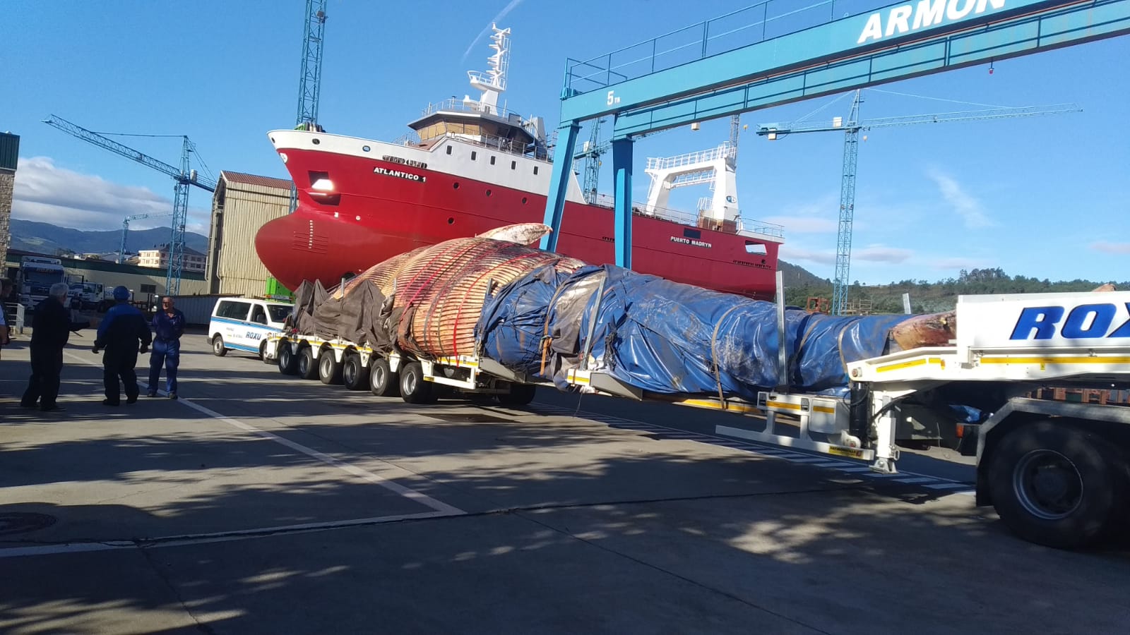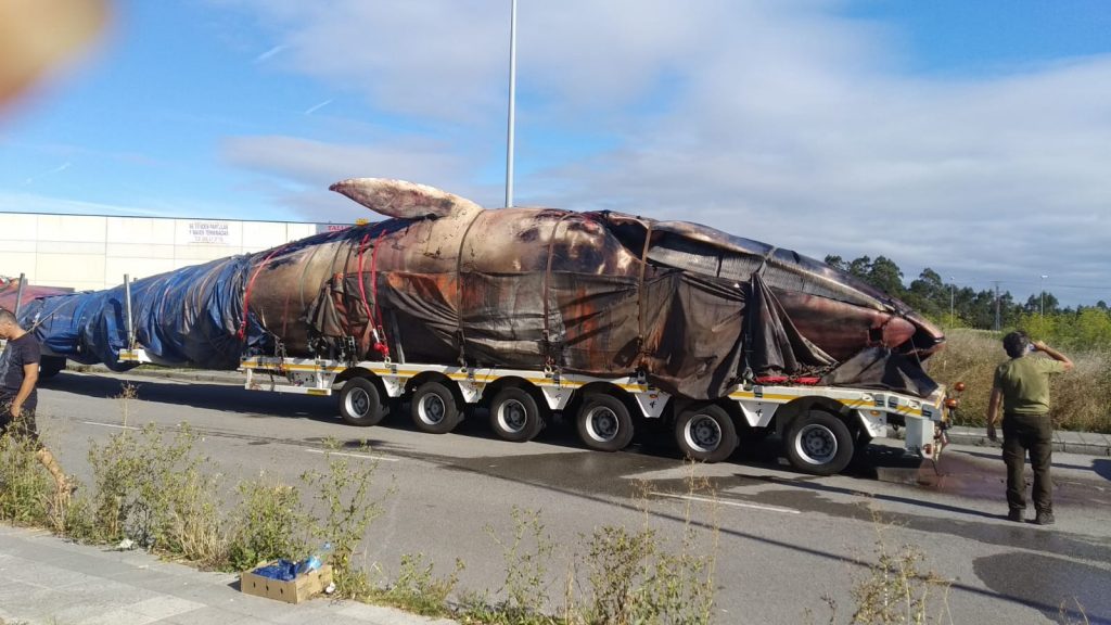 Hacia las 12,20 h de este sábado se espera la llegada a Cogersa- donde recibirá tratamiento por parte de Proygrasa- de la ballena muerta que desde ayer por la tarde, permanecía en la dársena de Astilleros Armón, de Navia, adonde llegó procedente de las costas de Tapia de Casariego, en un dispositivo organizado por la Consejería de Infraestructuras, en el que ha colaborado el ayuntamiento de Navia. La ballena, que tenía mayor peso del inicialmente calculado- alrededor de 50 toneladas- ha requerido de un transporte especial, de mayor porte que el previsto en un principio. Desde el equipo de gobierno del ayuntamiento de Navia se ha querido «agradecer la grandísima colaboración de Astilleros Armón» en este asunto. Además, el ayuntamiento ha puesto en marcha un dispositivo de limpieza especial, siguiendo al transporte en todo su trayecto, hasta la salida del concejo, para mantener en las mejores condiciones posibles, las calles y vías por donde aquel pasaba.