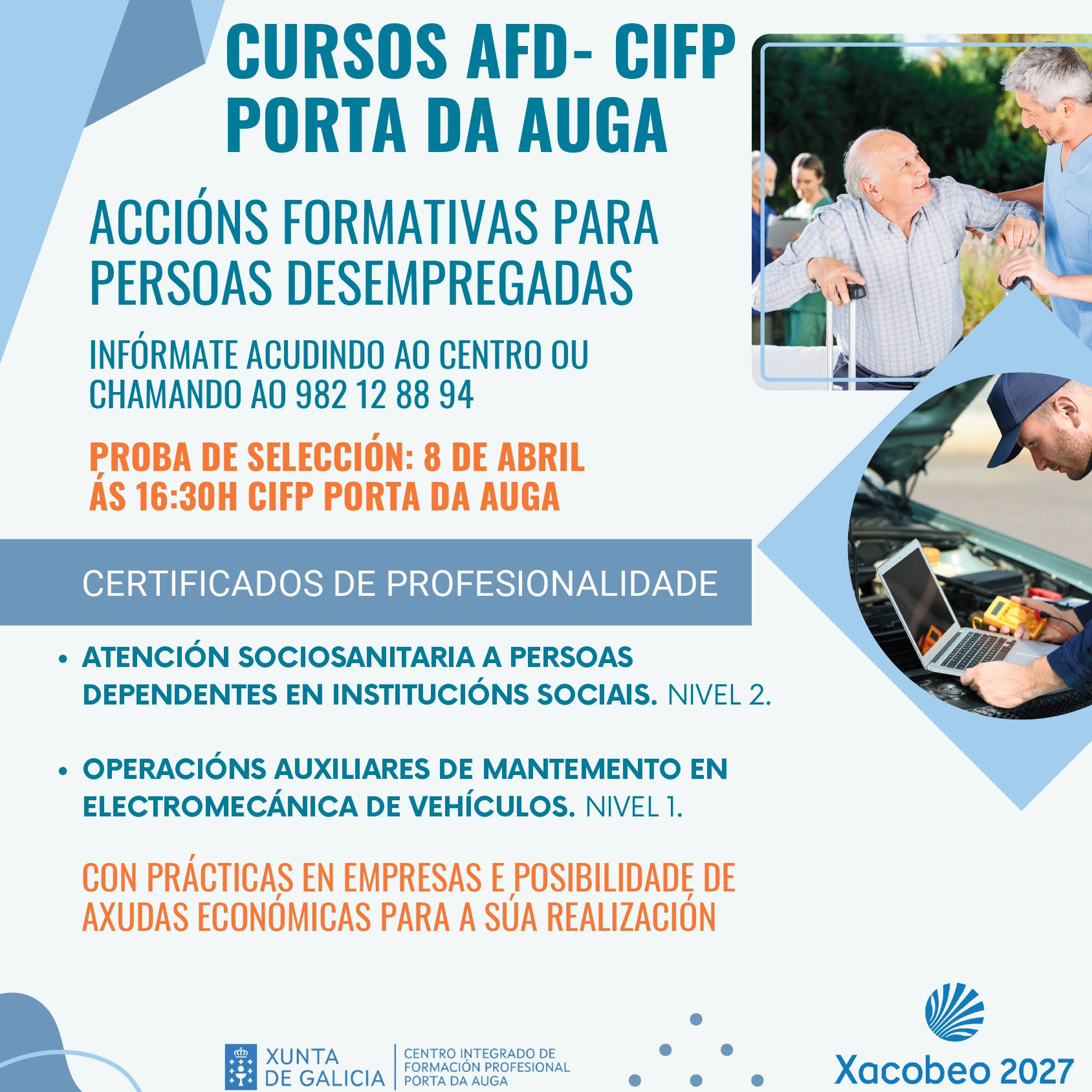 El Centro Integrado de Formación Profesional (CIFP) Porta da Auga, de Ribadeo, ofrece dos cursos gratuitos dirigidos a personas desempleadas, aunque también pueden inscribirse como mejora de empleo, aquellas personas que ya estén trabajando. Estas acciones formativas se desarrollarán entre abril y julio e incluyen prácticas en empresas, con posibilidad de ayudas económicas para su realización. Permitén, además, conseguir el certificado de profesionalidad. Los cursos son de: Atención sociosanitaria a personas dependientes en instituciones sociales y Operaciones auxiliares de mantenimiento en electromecánica de vehículos.