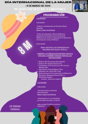 Son varias las propuestas del colegio público Pedro Penzol, de Puerto de Vega (Navia) para conmemorar el 8M: este miércoles, varias mujeres de la localidad que han trabajado y trabajan en diferentes sectores, han contado su experiencia al alumnado y familias. También se ha elaborado un mural «Mujeres detrás de la Historia» (entre ellas, la Generación de Mujeres Sinsombrero). En colaboración con la Asociación de Mujeres «La Romanela», se puede contemplar una exposición de sombreros realizados por las integrantes de La Romanela y el alumnado ha elaborado los suyos, utilizando materiales reciclados. El objetivo, «dar un nuevo significado al uso del sombrero». Cuentacuentos, talleres de ilustración… son otras propuestas pensadas con motivo del Día Internacional de la Mujer.