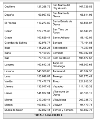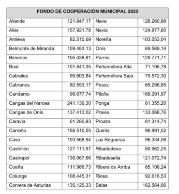 El Gobierno de Asturias ha aprobado un gasto de 8.350.000 euros para el Fondo de Cooperación Municipal, que se repartirá entre los 74 concejos con menos de 40.000 habitantes con el objetivo de fortalecer la economía local y las inversiones de los ayuntamientos. El reglamento que rige el Fondo de Cooperación Municipal, creado en 2008, establece que cada concejo recibirá una parte fija que este año asciende a 45.135,15 euros. El 60% restante se reparte en función de criterios de población, envejecimiento, superficie, orografía y dispersión poblacional.
