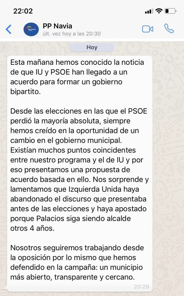 El Partido Popular de Navia se muestra «sorprendido» y «lamenta» que Izquierda Unida «haya abandonado el discurso que presentaba antes de las elecciones y haya apostado porque Palacios siga siendo alcalde otros 4 años». Y promete «seguir trabajando desde la oposición por lo mismo que hemos defendido en la campaña: un municipio más abierto, transparente y cercano».