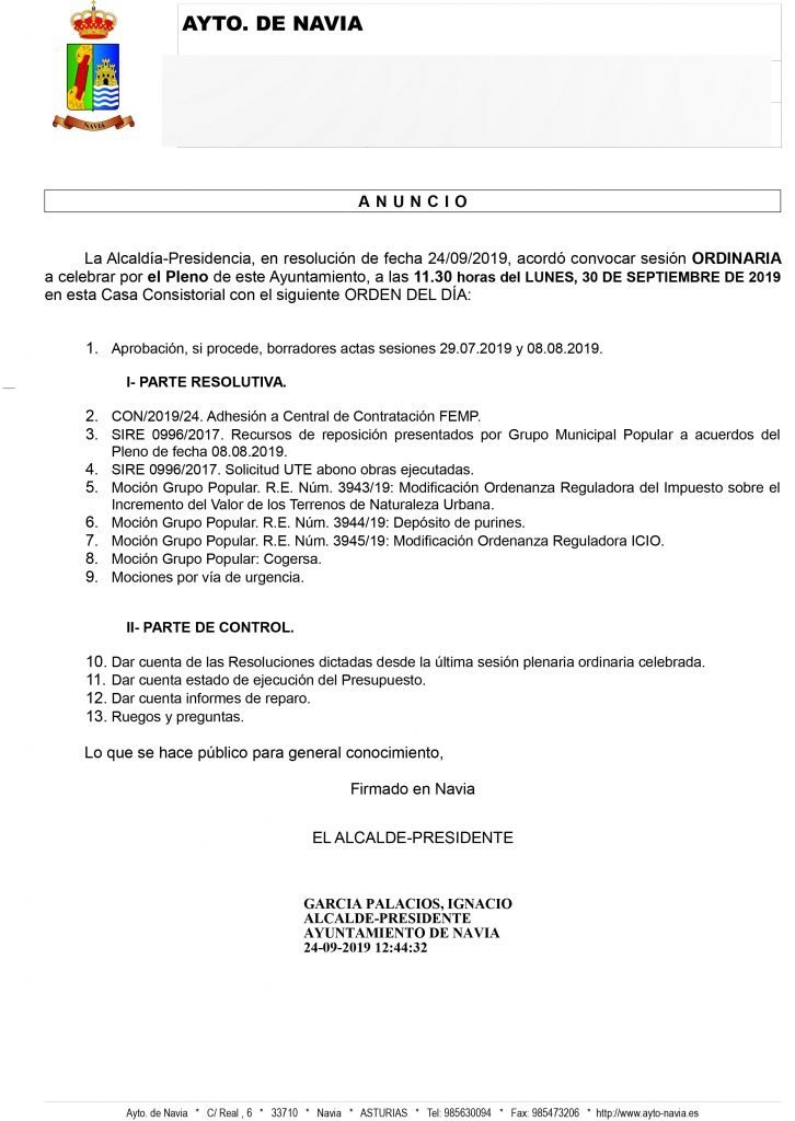 El PP de Navia presenta cuatro mociones al Pleno Ordinario del 30 de septiembre