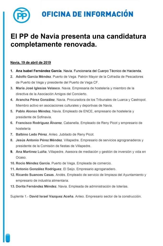 El Partido Popular de Navia ha completado la candidatura con la que concurrirá a las próximas elecciones municipales de mayo. Una lista «renovada al cien por cien», formada por personas «con trabajo, ninguno viene buscando una fuente de ingresos para vivir», ha señalado de la agrupación. Sus integrantes figuran a continuación: