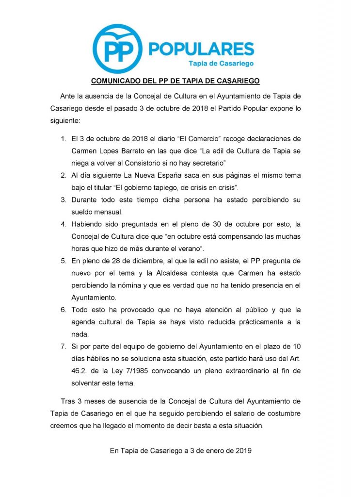 El PP de Tapia ha emitido un comunicado después de que la concejala de Cultura, Carmen López Barreto, haya dejado de acudir al ayuntamiento desde el pasado día 3 de octubre, pese a estar percibiendo su nómina. Situación que habría reconocido la propia alcaldesa, Ana Vigón, a preguntas del PP en el último pleno municipal. Señala el PP que todo esto provoca que la agenda cultural de Tapia haya quedado reducida a la mínima expresión y que no exista atención al público. Los Populares, creen que después de tres meses de ausencia pese a la percepción del sueldo por parte de la concejala de Cultura ha llegado el momento de poner fin a esta situación. De manera que, si el equipo de gobierno no la solventa en el plazo de diez días hábiles, en función del artículo 10 de la Ley 7/1985, el PP convocará un pleno extraordinario para solventar este problema.