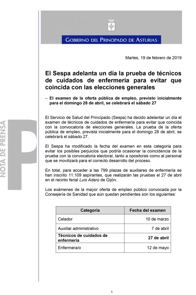 El Servicio de Salud del Principado (Sespa) ha decido adelantar un día el examen de técnicos de cuidados de enfermería para evitar que coincida con la convocatoria de elecciones generales. La prueba de la oferta pública de empleo, prevista inicialmente para el domingo 28 de abril, se celebrará el sábado 27.