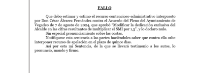 El Tribunal de lo Contencioso Administrativo de Oviedo ha declarado NULO el acuerdo adoptado por el pleno del ayuntamiento de Vegadeo, el 7 de agosto de 2024, de modificar la dedicación exclusiva del alcalde, César Álvarez, «en las cifras resultantes de multiplicar el SMI (salario mínimo interprofesional) por 1,5». Desde septiembre de 2024, Álvarez comenzó a percibir no su dedicación exclusiva (algo más de 43.000 euros brutos anuales) sino 23.814 euros brutos anuales (es decir, el SMI por 1,5). La oposición había aprobado ese acuerdo ante, señalaba, las ausencias reiteradas del alcalde de su puesto de trabajo y desconociéndose cuál era su horario.