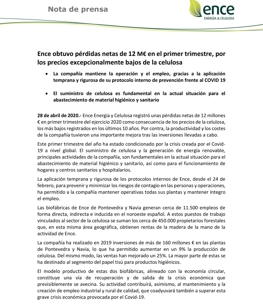 Ence Energía y Celulosa registró unas pérdidas netas de 12 millones € en primer trimestre del ejercicio 2020 «como consecuencia de los precios de la celulosa». Por contra, han mejorado la productividad y los costes de la compañía tras las inversiones llevadas a cabo. La compañía ha realizado en 2019 inversiones de más de 160 millones € en las plantas de Pontevedra y Navia, lo que ha permitido aumentar en un 9% la producción de celulosa. Del mismo modo, las ventas han mejorado un 25%. La mayor parte de estas se ha destinado al segmento del papel tisú para productos higiénicos.