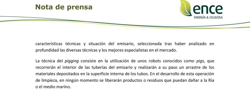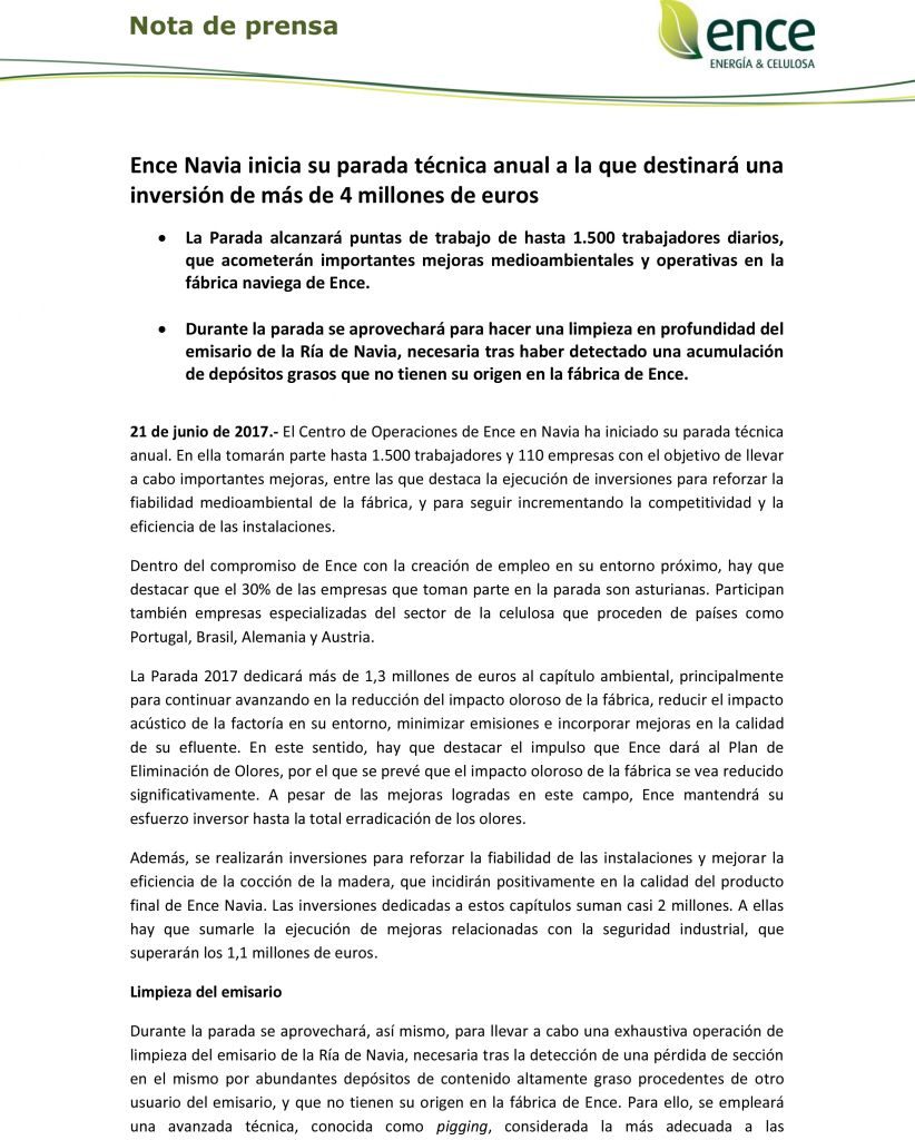 Ence Navia inicia su parada técnica anual a la que destinará una inversión de más de 4 millones de euros. Durante la parada se aprovechará para hacer una limpieza en profundidad del emisario de la Ría de Navia, necesaria tras haber detectado una acumulación de depósitos grasos «que no tienen su origen en la fábrica de Ence», si no en otro usuario del emisario. Utilizará unos robots especiales que recorrerán el interior de las tuberías del emisario, arrastrando a su paso los materiales depositados en al cara interna de los tubos. Durante la operación de limpieza «en ningún momento se liberarán productos o residuos que puedan dañar a la Ría o al medio marino», señala la empresa.