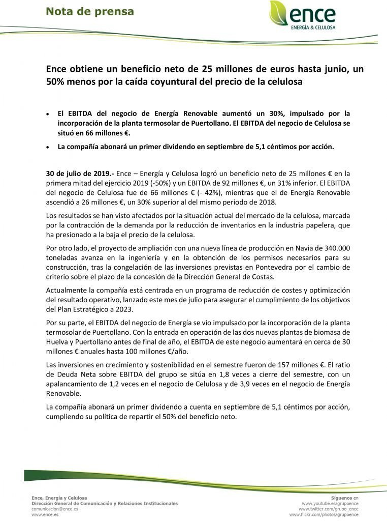 Ence – Energía y Celulosa logró un beneficio neto de 25 millones € en la primera mitad del ejercicio 2019 (-50%) y un EBITDA de 92 millones €, un 31% inferior. El EBITDA del negocio de Celulosa fue de 66 millones € (- 42%), mientras que el de Energía Renovable ascendió a 26 millones €, un 30% superior al del mismo periodo de 2018. Los resultados se han visto afectados por la situación actual del mercado de la celulosa, marcada por la contracción de la demanda por la reducción de inventarios en la industria papelera, que ha presionado a la baja el precio de la celulosa.