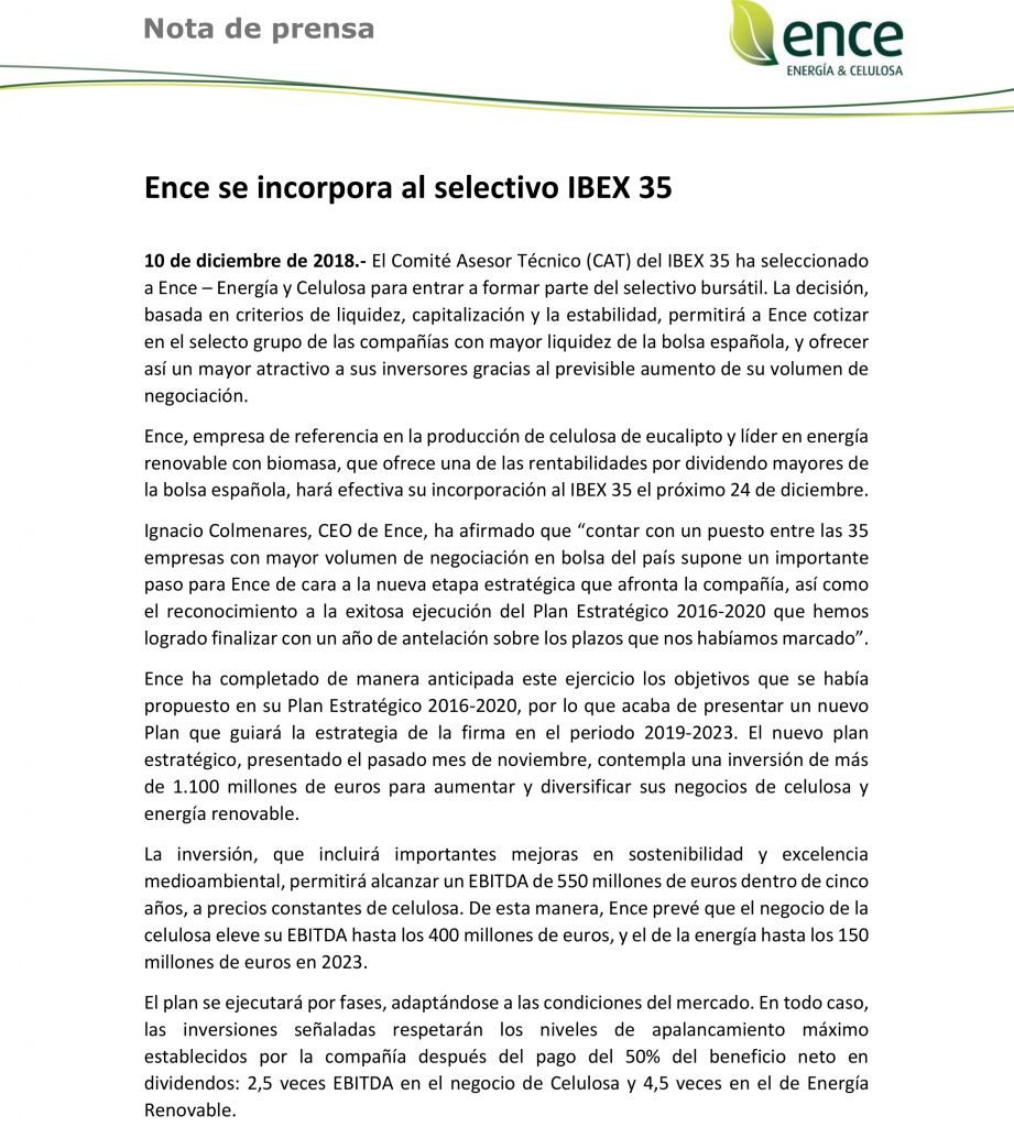 El Comité Asesor Técnico (CAT) del IBEX 35 ha seleccionado a Ence – Energía y Celulosa para entrar a formar parte del selectivo bursátil. Hará efectiva su incorporación al IBEX 35 el próximo 24 de diciembre. Ignacio Colmenares, CEO de Ence, ha afirmado que “contar con un puesto entre las 35 empresas con mayor volumen de negociación en bolsa del país supone un importante paso para Ence de cara a la nueva etapa estratégica que afronta la compañía, así como el reconocimiento a la exitosa ejecución del Plan Estratégico 2016-2020 que hemos logrado finalizar con un año de antelación sobre los plazos que nos habíamos marcado”.