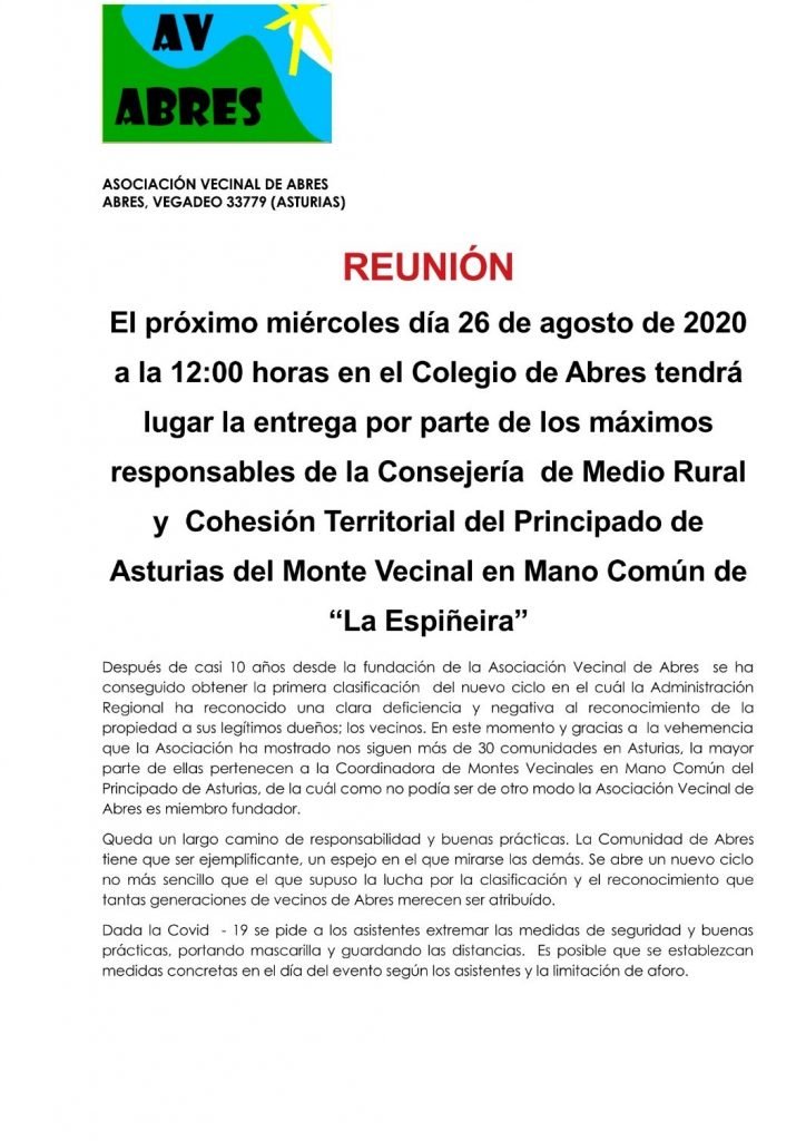 Para el próximo miércoles, 26 de agosto está convocada en el colegio de Abres (Vegadeo) una reunión con responsables de la consejería de Medio Rural, quienes harán entrega del Monte Vecinal de Mano Común «A Espiñeira».