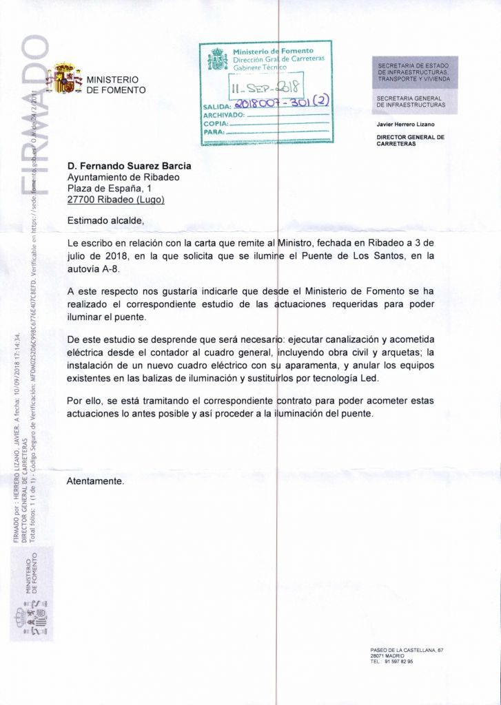El alcalde de Ribadeo, Fernando Suárez Barcia, ha mostrado su satisfacción con el compromiso del Ministro de Fomento, José Luis Ábalos, de acometer las actuaciones necesarias para proceder a iluminar el Puente de los Santos a la mayor brevedad posible. Una «muy buena noticia tanto para Ribadeo como para Castropol», señala.