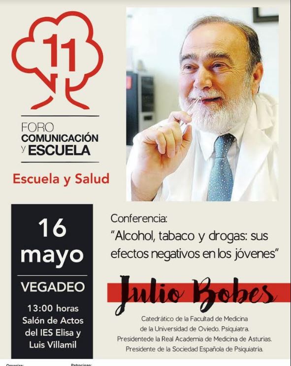 El médico psiquiatra Julio Bobes impartió en Vegadeo la conferencia “Alcohol, tabaco y drogas: sus efectos negativos en los jóvenes”. Julio Bobes preside la Sociedad Española de Psiquiatría, la Real Academia de Medicina de Asturias y es catedrático de la Universidad de Oviedo. El acto se enmarca en el proyecto “Escuela y salud” del XI Foro Comunicación y Escuela del IES Elisa y Luis Villamil.