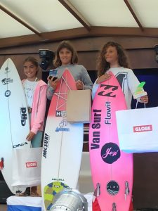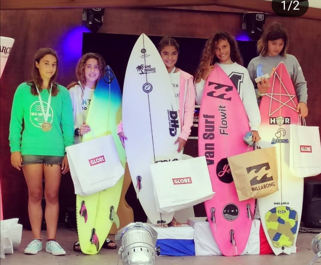 La surfista tapiega Kenia López, logró la primera posición en categoría sub-12 y la segunda en sub-14 en el Campeonato Playa España de Surf disputado en Villaviciosa. La prueba era puntuable para el circuito Guajes. En la imagen Kenia como campeona en sub-12 en el podium.