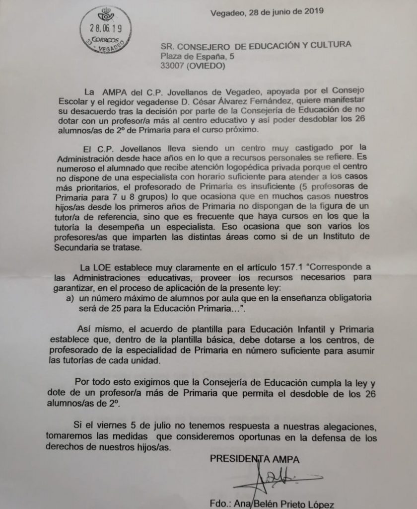 Desde el AMPA del colegio Jovellanos de Vegadeo se manifiesta «desacuerdo» tras la decisión de la consejería de Educación de no dotar con un profesor/ora más al centro educativo, para poder desdoblar los 26 alumnos/as de Primaria para el próximo curso (cuando la ley prevé que haya un máximo de 25 alumnos por aula). Afirman que el colegio Jovellanos está siendo “muy castigado” en cuanto a recursos personales se refiere, con mucho alumnado que recibe atención logopédica privada porque el colegio no dispone de especialista con horario suficiente para atender los casos prioritarios, con un profesorado de Primaria insuficiente… Y señala que si antes del 5 de julio no tienen respuesta a sus alegaciones, tomará las medidas oportunas en defensa del derecho a la educación de sus hijos/as.