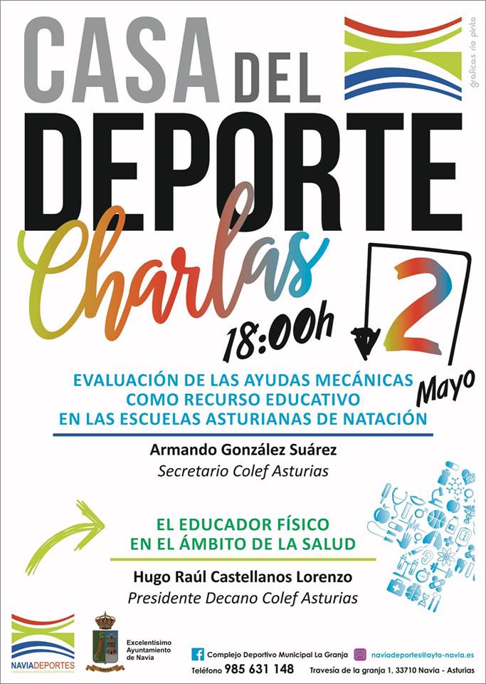 La Casa del Deporte de Navia acogerá el próximo jueves 2 de mayo, a las 18 horas, Dos Charlas sobre Actividad Física y Deportiva y Salud. La primera de ellas lleva por título Evaluación de las Ayudas Mecánicas como Recurso Educativo de las Escuelas Asturianas de Natación que será impartida por Armando González, Secretario de Colef Asturias (Colegio de Licenciados en Educación Física de Asturias). La segunda se denomina El Educador Físico en el Ámbito de la Salud y será desarrollada por Hugo Castellanos (Presidente Decano de Colef Asturias). La organización corre a cargo del Consejo Deportivo Municipal Naviego en colaboración con Colef Asturias.