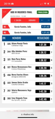 La atleta naviega, residente en Cataluña, Alba Antuñez Pérez (Club GEiE Gironi), logró la Medalla de Plata en la Prueba de 600 mts. Femenino en el Campeonato de España Sub-16 de Pista Cubierta disputado en Valencia. Alba fue primera en su semifinal con un tiempo de 1:39.42 y al día siguiente en la Final realizó una marca de 1:38.12 tras remontar hasta lograr la 2ª posición. Su mejor tiempo en esta distancia es 1:36.86. Ahora a comenzar a preparar la pista al aire libre.