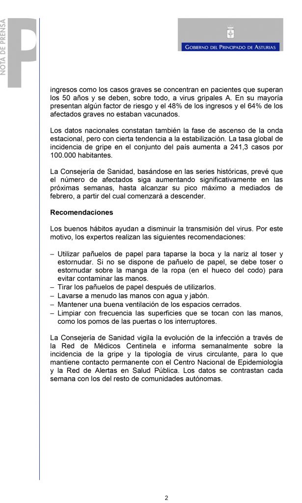 La onda epidémica de la gripe continúa en Asturias en fase ascendente por cuarta semana consecutiva y lo hace ya de forma significativa y en todos los grupos de edad, pero con especial relevancia entre los menores de 15 años. Esto, unido al aumento de los aislamientos de virus gripales A, indica que prosigue la fase de subida de la epidemia estacional. La incidencia alcanza en el Principado los 440,1 casos por 100.000 habitantes y la tasa estandarizada por edades es de 311,3, lo que equivale a unas 3.212 personas con esta patología en la semana anterior. La situación se considera de intensidad media y difusión epidémica.