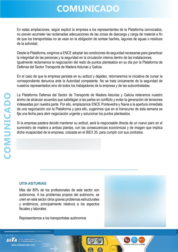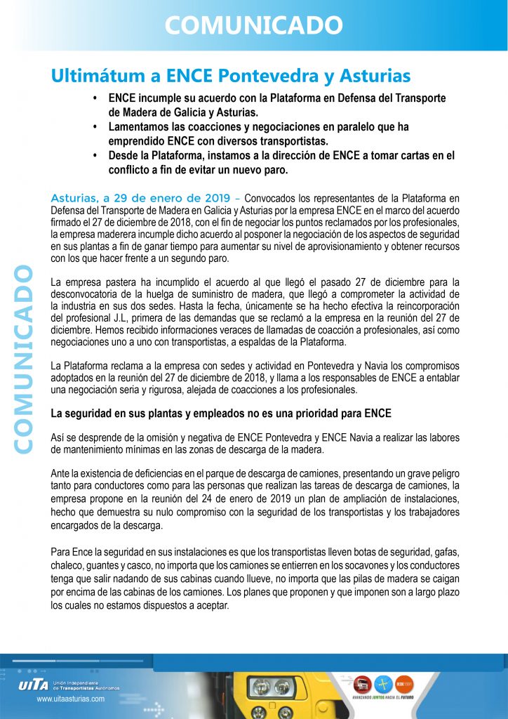 La Plataforma en Defensa del Transporte de Madera de Galicia y Asturias pide a ENCE que retome las negociaciones con el sector, dado que la papelera «incumple su acuerdo, al posponer hasta marzo la negociación, y no mostrar interés en mejorar las condiciones de seguridad de las plantas».