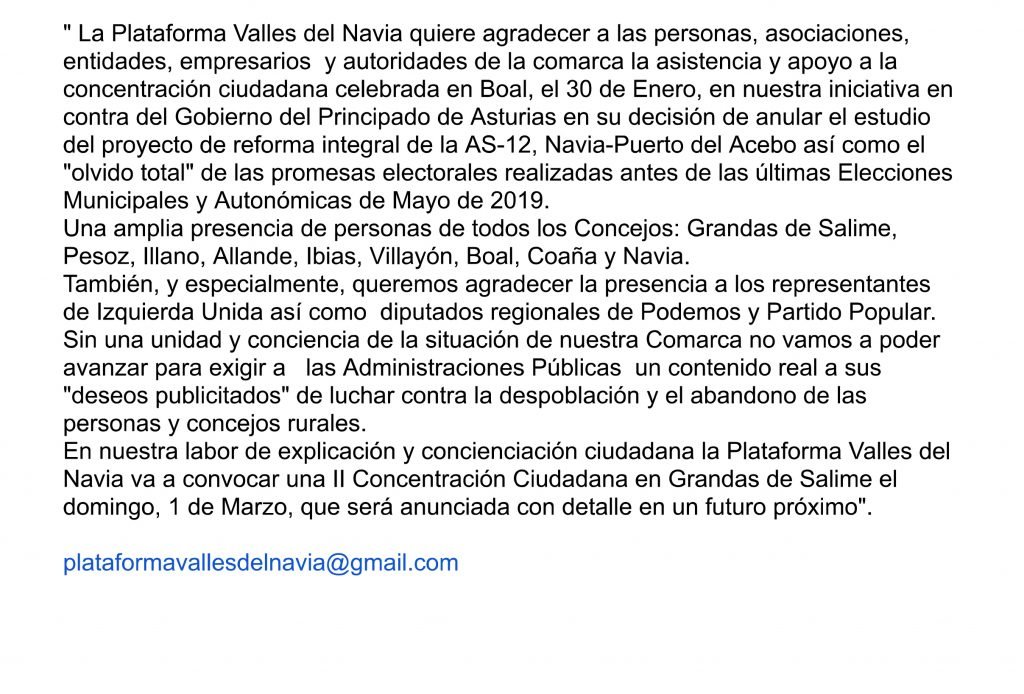 La Plataforma Valles del Navia convocará una II Concentración Ciudadana en Grandas de Salime el domingo, 1 de Marzo, que anunciará «con detalle en un futuro próximo». Al tiempo, agradece la asistencia a la primera concentración ciudadana que se celebró en Boal el pasado 30 de enero.