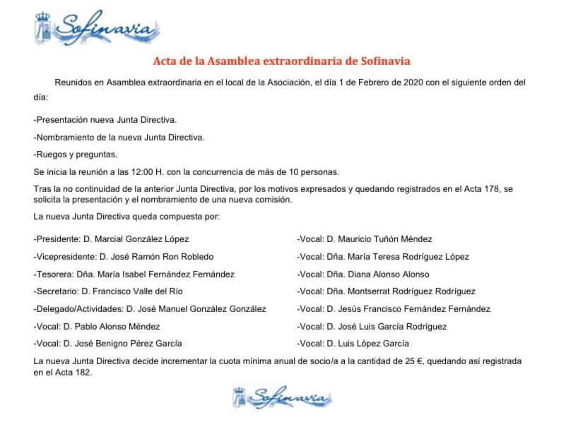 La nueva directiva, que ha decidido incrementar la cuota mínima anual del socio/socia a 25 euros al año, está presidida por Marcial González. Como vicepresidente está José Ramón Ron Robledo; tesorera, María Isabel Fernández Fernández y secretario, Francisco Valle del Río. Son vocales de Sofinavia, en esta nueva singladura, Pablo Alonso, José Benigno Pérez, Mauricio Tuñón, María Teresa Rodríguez, Diana Alonso, Montserrat Rodríguez, Jesús Francisco Fernández, José Luis García y Luis López.
