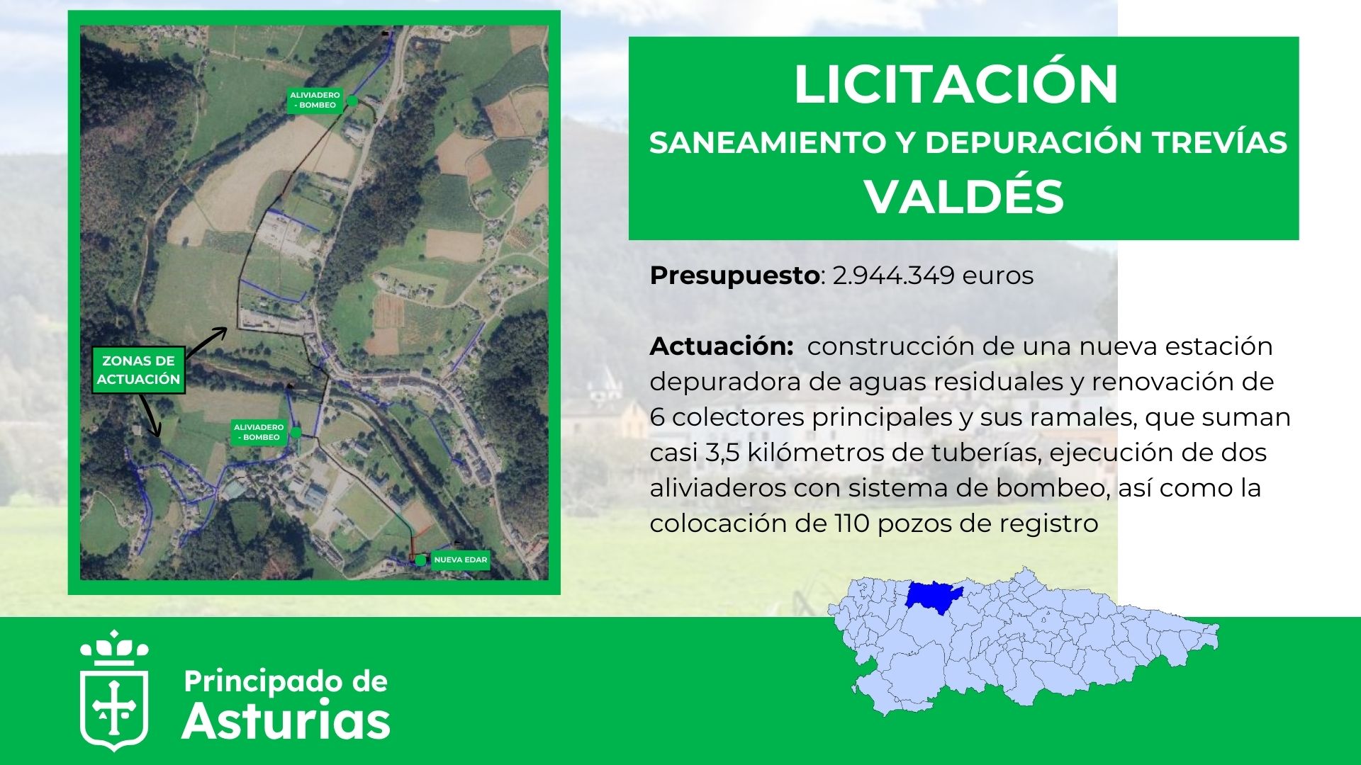 La Consejería de Movilidad, Medio Ambiente y Gestión de Emergencias ha licitado por 2.944.349 euros la renovación de la red de saneamiento y la depuración de Trevías, en Valdés, una actuación que beneficiará a cerca de 500 vecinos. Las empresas pueden presentar sus ofertas hasta el 3 de marzo. Las mejoras previstas con la obra permitirán incrementar la eficiencia y la fiabilidad del sistema, al tiempo que se optimizan los actuales servicios de saneamiento en parte de la localidad, y se amplían a áreas que hasta ahora quedaban fuera de la red.