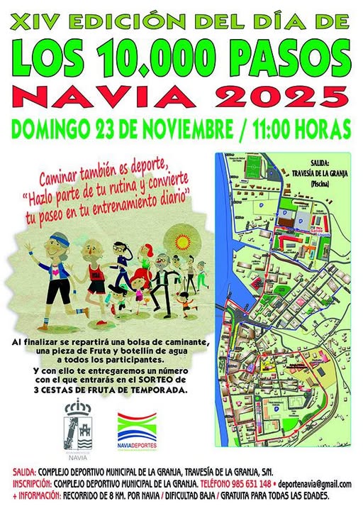 Navia celebra el domingo la XIV Edición del Día de los 10.000 Pasos consistente en una caminata de 8 kms por distintos puntos de la villa y alrededores de dificultad baja y apta para todas las edades. La salida será a las 11 horas de la Travesía de la Granja y la inscripción gratuita se debe realizar en el Complejo Deportivo Municipal de la Granja. Al finalizar se hará entrega de la bolsa del caminante a todos los participantes y se sortearán tres cestas de fruta.