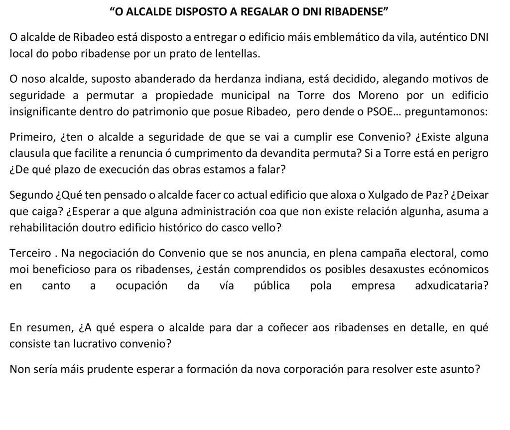 Por su parte, el Psoe de Ribadeo considera que el alcalde, Suárez Barcia, está «dispuesto a regalar el DNI ribadense»- en referencia al emblemático edificio.