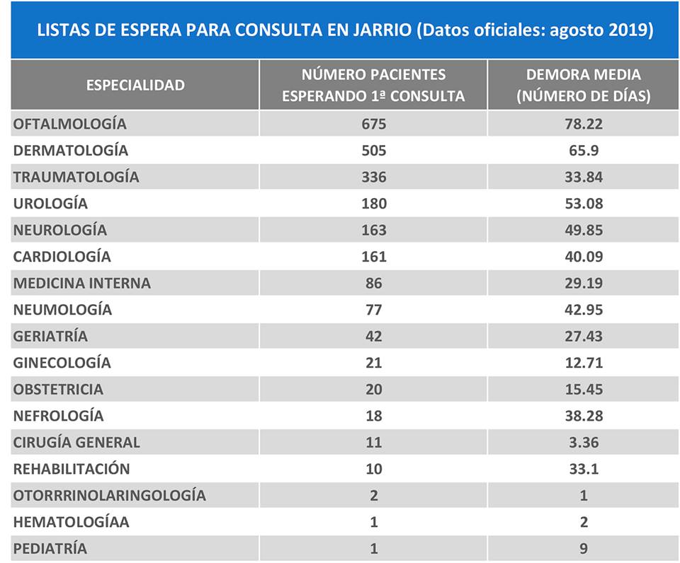 La Plataforma Jarrio Salvemos Nuestro Hospital se pregunta si las listas de espera oficiales de agosto pasado, ofrecen datos reales o si muchas veces se anulan citas y se reducen “mágicamente” esas esperas. En concreto, se pueden ver los días que espera un paciente para ser atendido en una primera consulta, pero no se reflejan los datos para revisiones o posteriores consultas.