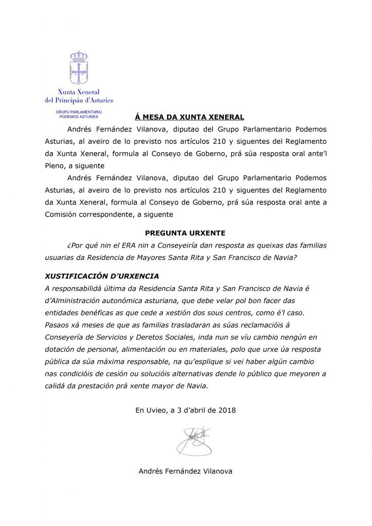 Podemos Asturias pregunta a la consejera de Servicios y Derechos Sociales por la Residencia de Mayores Navia, por qué ni la consejería ni el Era (el organismo autónomo Establecimientos Residenciales para Ancianos) dan respuesta a las quejas formuladas meses atrás por las familias de los usuarios de la Residencia, y si va a haber o no, algún cambio en las condiciones de gestión o soluciones alternativas que mejoren la calidad de prestaciones que reciben las personas usuarias de la residencia. Andrés Fernández Vilanova es diputado de Podemos Asturias por Occidente.