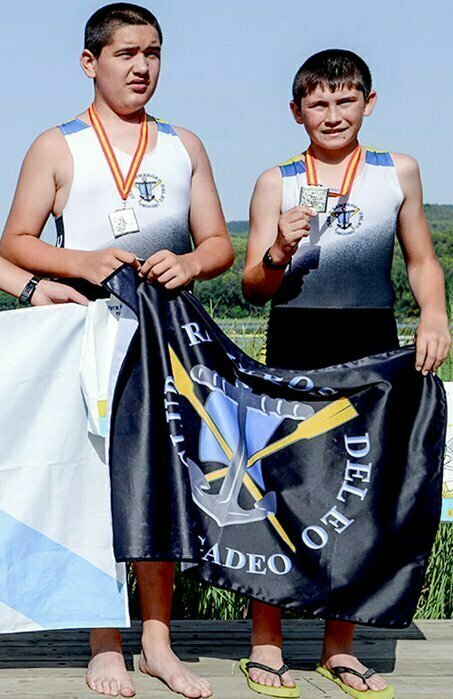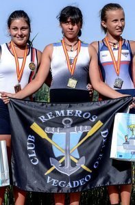 La trayectoria del Doble Scull Cadete Masculino Veigueño, a lo largo de la temporada, tras el Subcampeonato Nacional conseguido en solitario por Antonio Mediante Vale (en el In-Door Estatal) y la victoria en mayo pasado de ambos (Antonio Mediante Vale y Gerardo González Alzu), en la XXVII Copa Primavera, ya en el Doble Scull, permitían albergar fundadas esperanzas de alcanzar un éxito relevante, cómo a la postre así fue, en una regata muy vibrante y con un final espectacular, que colocó al dueto Veigueño como Campeones de España 2019, tras haber ocupado la 6ª plaza de la modalidad en 2014, la 2ª en el 2015 y la 5ª en 2017. Para el Club Veigueño, pese a ser éste su 33º título nacional, es el 1º que logra en dicha modalidad y categoría (Doble Cadete Masculino), en la que si bien había logrado subir al pódium en tres ocasiones (1992, 1994 y 1997), “sólo” había conseguido anotarse hasta ahora dos Platas y un Bronce, aunque los dos Subcampeonatos precedentes (1992 y 1994), fueran engalanados con sendas Medallas de Bronce. Por su parte, Julia Córdoba Muro, Medallista en la modalidad de Skiff, de modo ininterrumpido desde el 2015, vio truncada su racha de Cuatro “Preseas” consecutivas (2 Oros, 1 Plata y 1 Bronce), tras finalizar la competición en la 4ª plaza, aunque habiéndose mantenido en la lucha por los metales hasta pocos metros antes de llegar a meta. La larga serie de problemas médicos padecidos a lo largo de toda la temporada, al final le pasaron factura, pero así a todo supo y pudo mantenerse a un buen nivel. Por último, Andrés Álvarez de la Linera Echeverría, debutante en la categoría Sub23, supo sobreponerse a su “parón” en la Semifinal, que le privó de remar su 11ª Final Estatal consecutiva, imponiéndose con claridad en una Final B que lideró de principio a fin, anotándose un 7ª plaza en la general y mejorando incluso el registro del 6º Finalista, actuación que le ha llevado a ser convocado para la Selección Nacional de dicha categoría. En la Foto Julia, en el centro, cuando logró su primera medalla en alevín femenino.