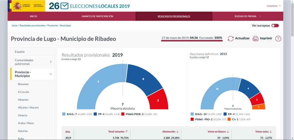 Ribadeo: 7 concejales BNG, 4 concejales PP, 2 concejales PsdeG-Psoe