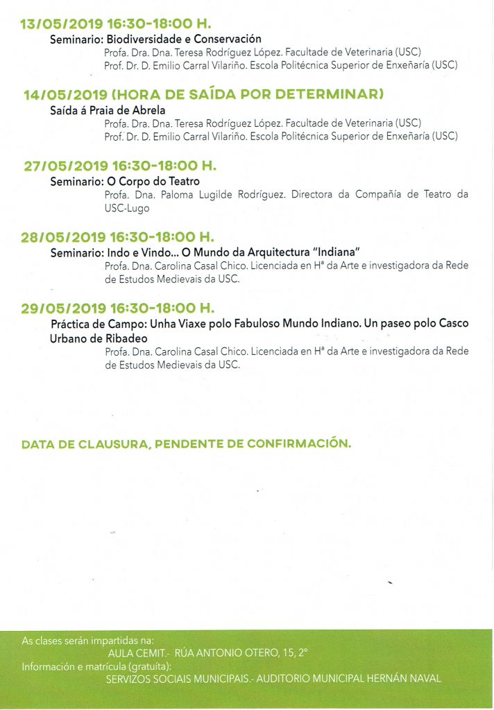 Ribadeo acogerá el programa de la Universidad de Santiago de Compostela, Camiños de Coñecemento e Experiencia, dirigido a personas mayores de 50 años. La actividad comenzará el 13 de mayo y las inscripciones pueden hacerse en el Área de Servicios Sociosanitarios, del 2 al 12 de este mes. El objetivo acercar el conocimiento de las diferentes áreas de investigación a las villas que así lo piden. En Ribadeo habrá 3 seminarios durante el mes de mayo, para los que es necesaria la inscripción, ya que se dispone de 15 plazas en cada uno. Así lo han explicado la directora del Programa Universitario de Mayores de la USC, Esther Olveira, la concejala de Servicios Sociosanitarios en Ribadeo, Sonia Meilán y el alcalde, Fernando Suárez Barcia.