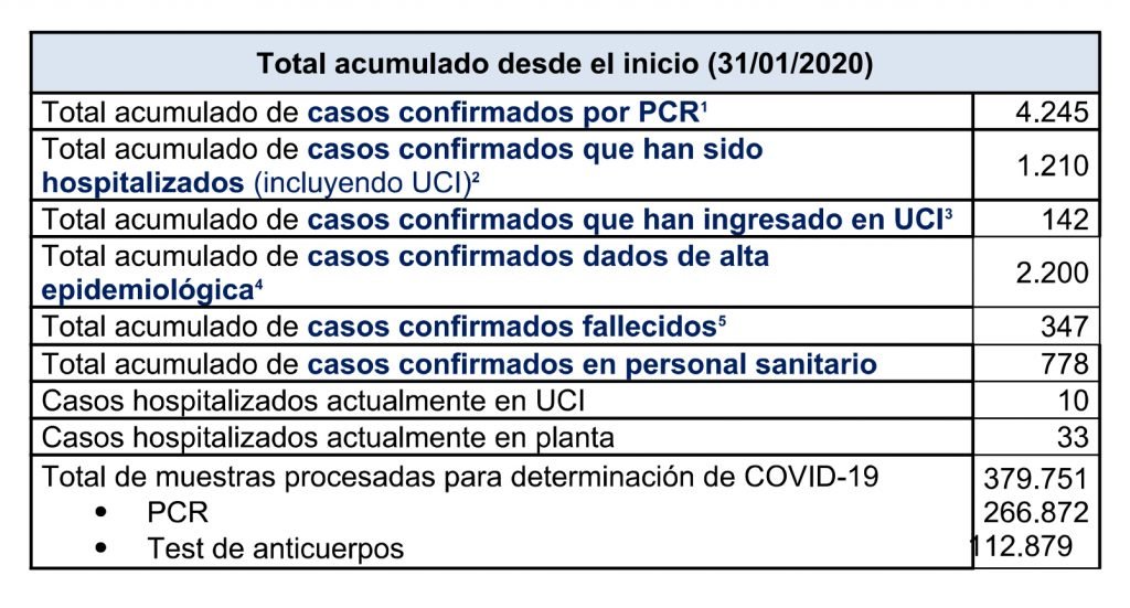 1. Casos acumulados totales confirmados mediante PCR. Hoy se incorpora un caso menos al detectarse su contabilización por duplicado.