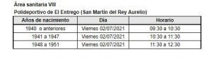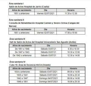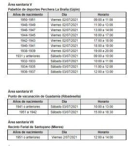 El Servicio de Salud del Principado de Asturias (Sespa) ha realizado un llamamiento público a la población de más de 70 años que no ha sido vacunada contra la covid para recibir la primera dosis. Se trata de ciudadanos que, en un principio, habían rechazado la profilaxis o con los que no se pudo contactar telefónicamente. El proceso de vacunación se llevará a cabo los días 2, 3 y 4 de junio en todas las áreas sanitarias. En el Área Sanitaria I será el 2 de julio, en el Salón de Actos del Hospital Comarcal de Jarrio (Coaña), de 11,30 a 13,30 horas.
