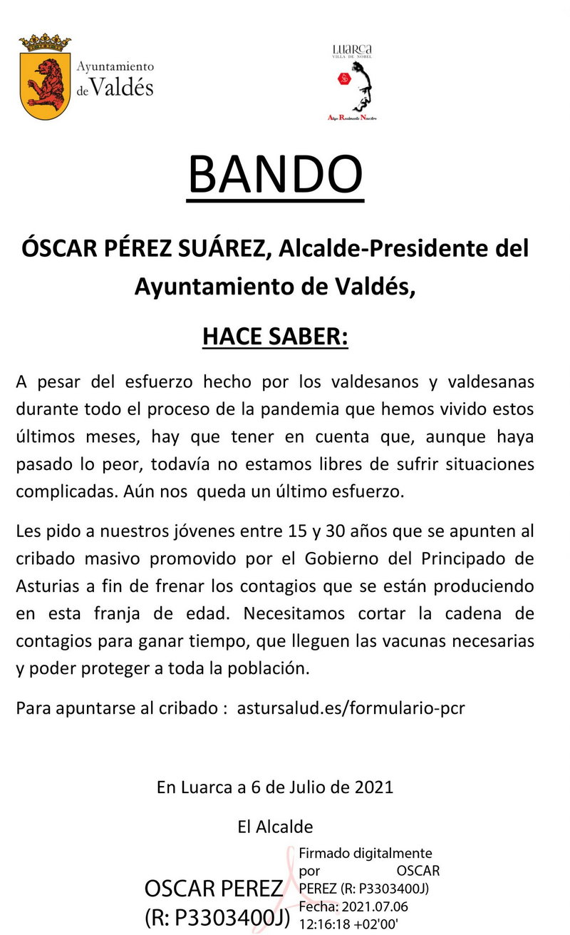 El alcalde de Valdés anima a los jóvenes a participar en el cribado masivo covid-19 promovido por el gobierno regional
