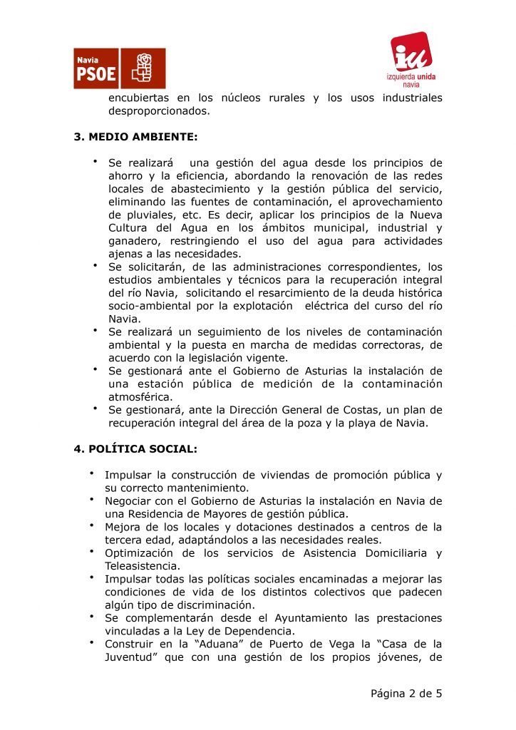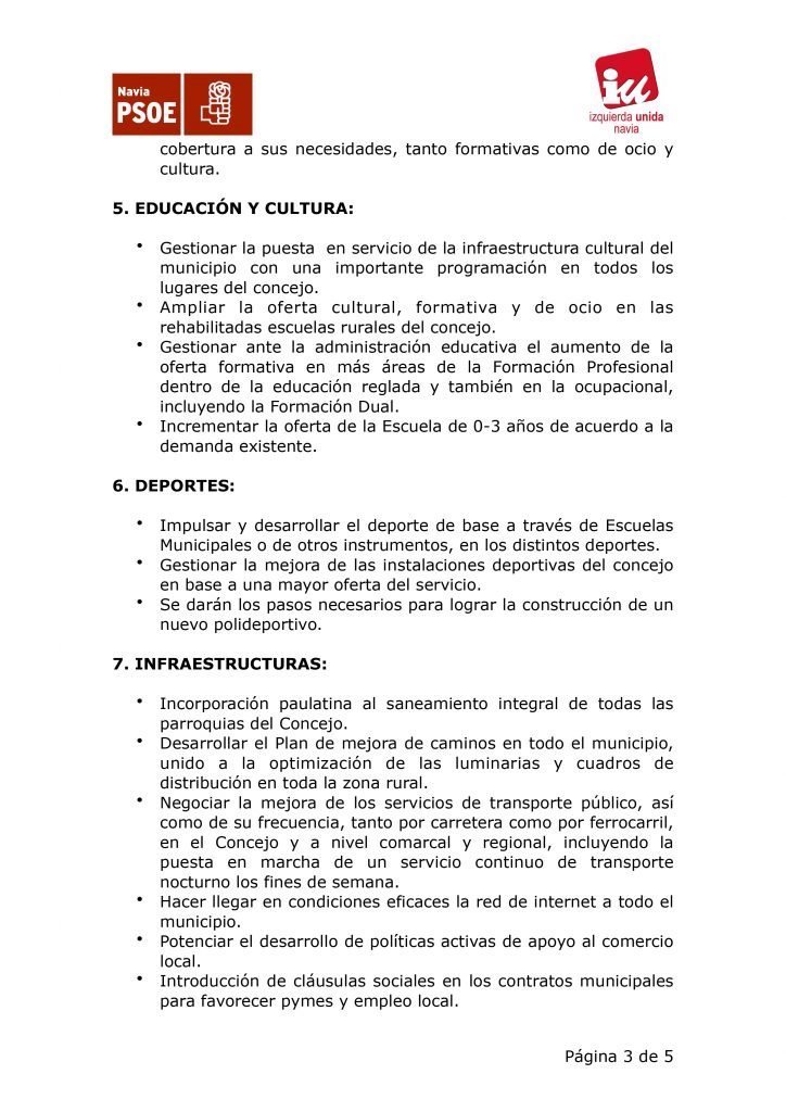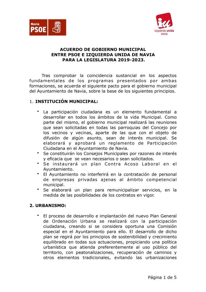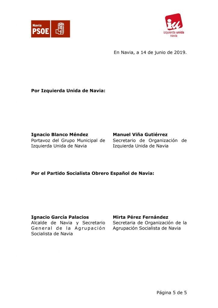 Partido Socialista e Izquierda Unida en Navia han firmado este mediodía, el acuerdo para la legislatura municipal 2019-2023. En función de este acuerdo, PSOE (con seis concejales) e IU (2 concejales) forman un equipo de gobierno al frente del cual estará el actual alcalde en funciones de Navia, Ignacio García Palacios. Este sábado, 15 de junio, a las 12 del mediodía, se celebrará el pleno de investidura.